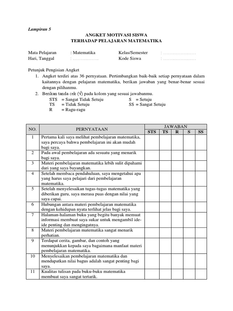 Lampiran 5: Angket Motivasi Siswa Terhadap Pelajaran